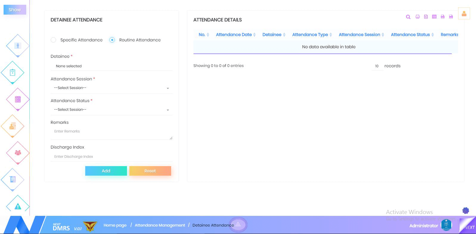 The attendance information has two types- specific attendance and routine attendance. The attendance information includes the detainee name, attendance session, attendance status, remarks, and the discharge index.