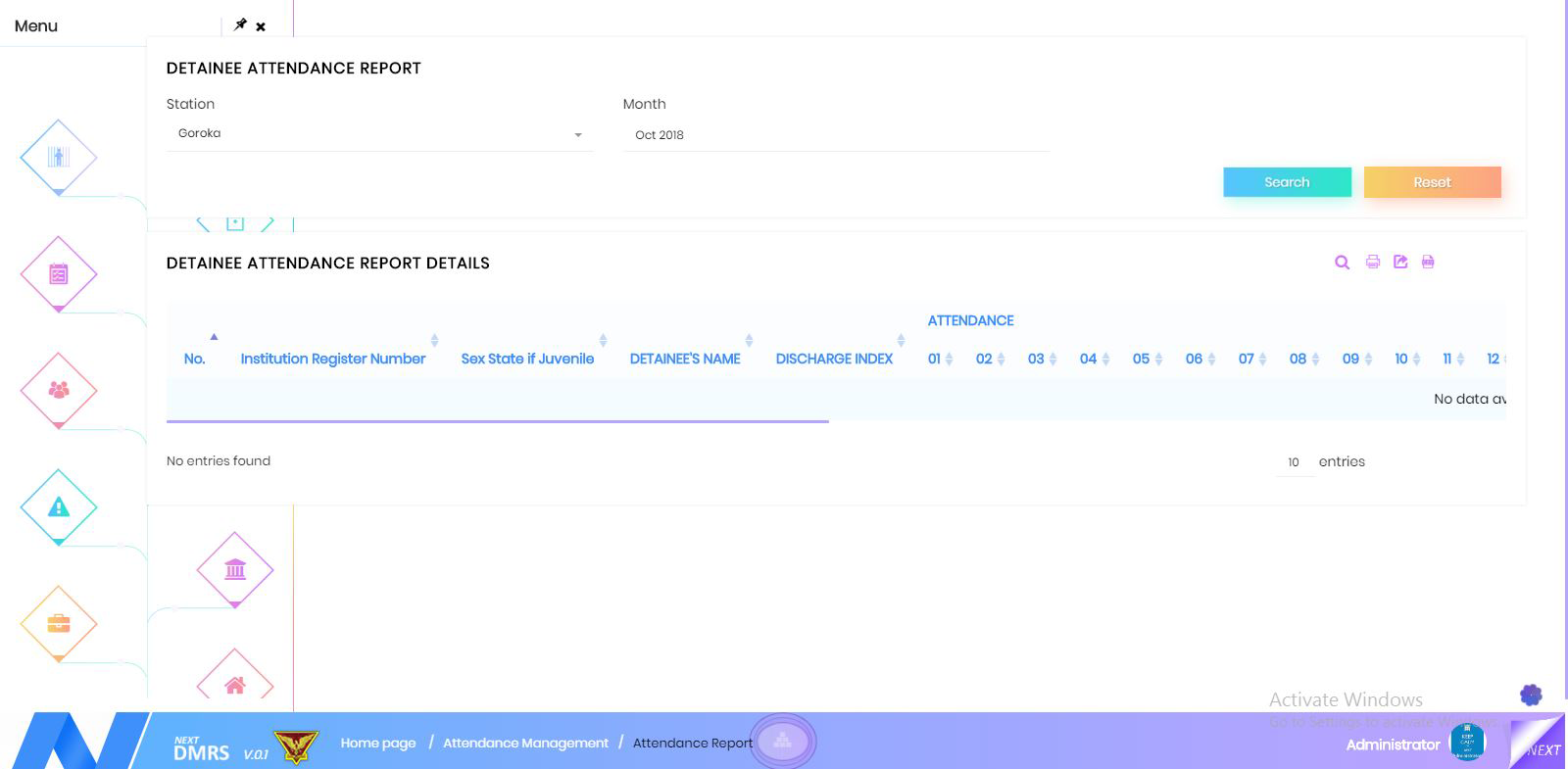 Attendance report captures the attendance details of the detainees. It includes the station name, from the date and to date of the detainee. By using the details, you can generate the reports of the detainees.