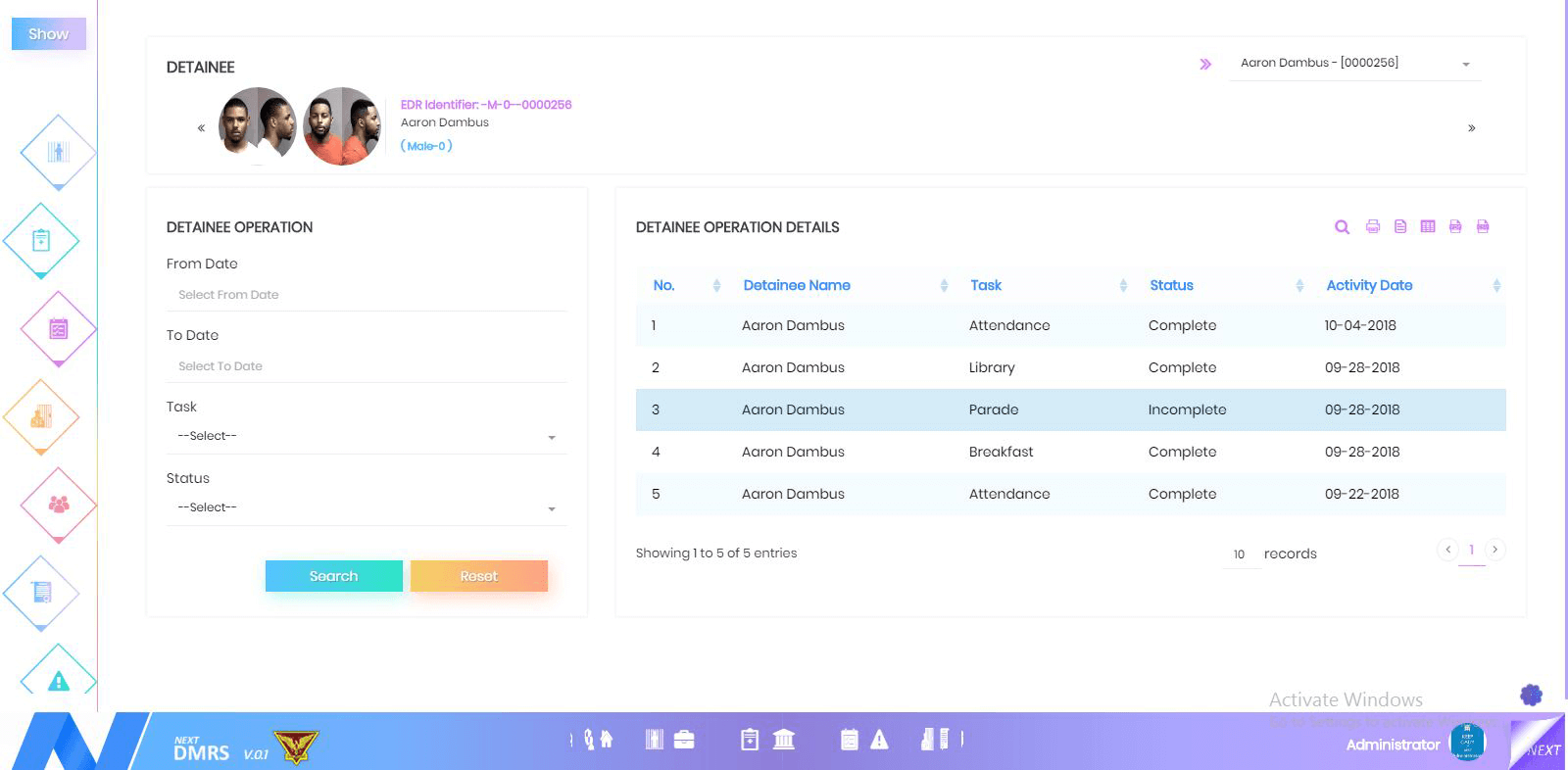 Detainee operation detail tracks every task of the detainee with the status of completed or not completed. It also includes the details of the time period.