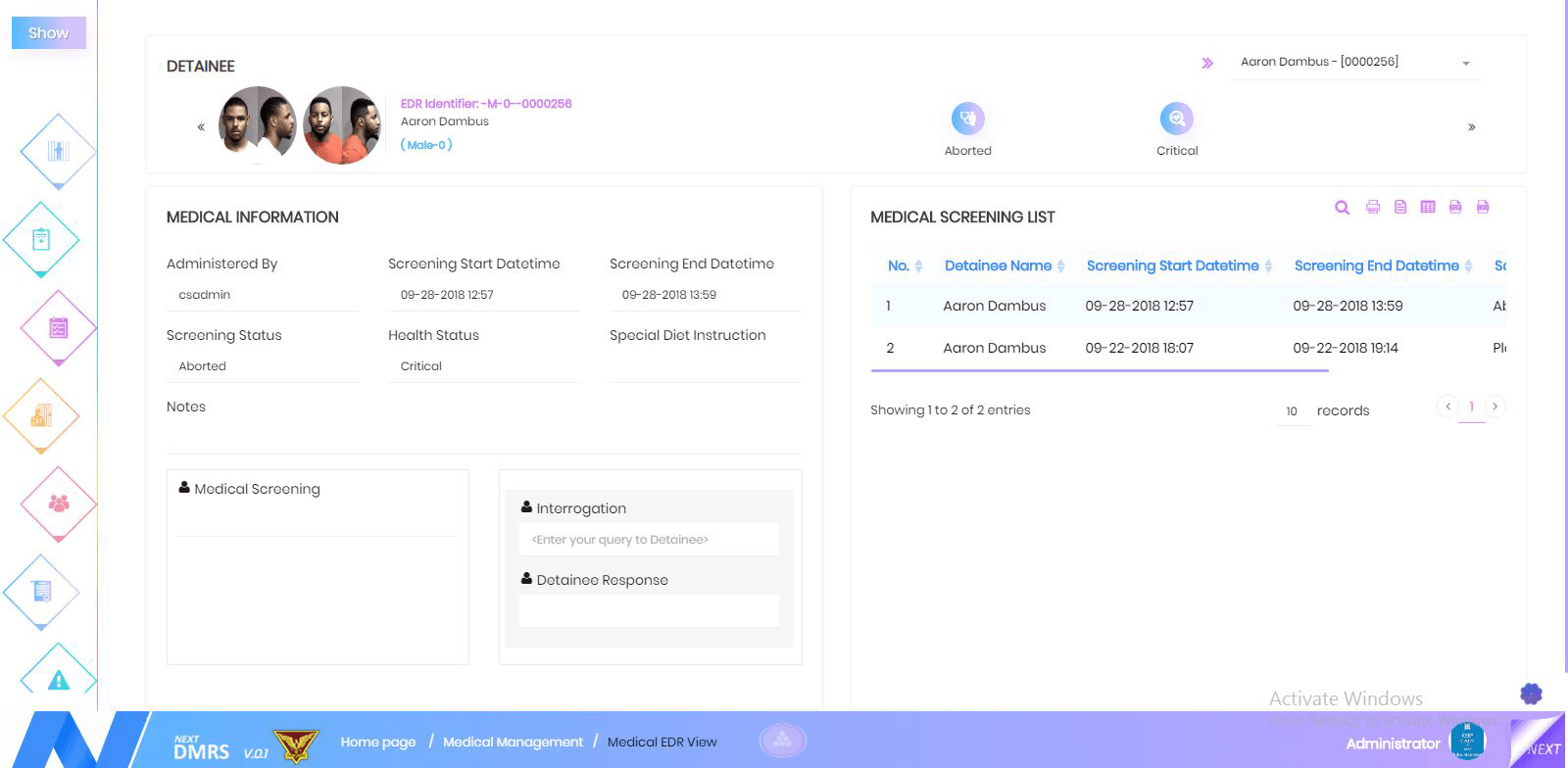 Initial screening assessment encompasses to decide quickly based on medical screening of the detainees. This module facilitates to maintain the tenure of the medical screening period and medical administrator who is responsible for the medical screening process.