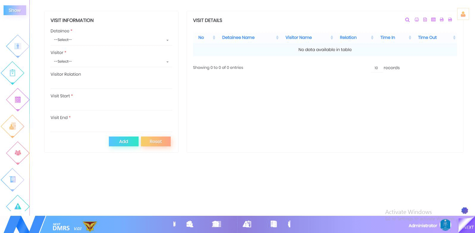 Visitor details facilitate to capture the visitor information of the detainees. It includes visitor name, visitor relation type, national identification category, national identification number, regular in time and out, contact number and address.