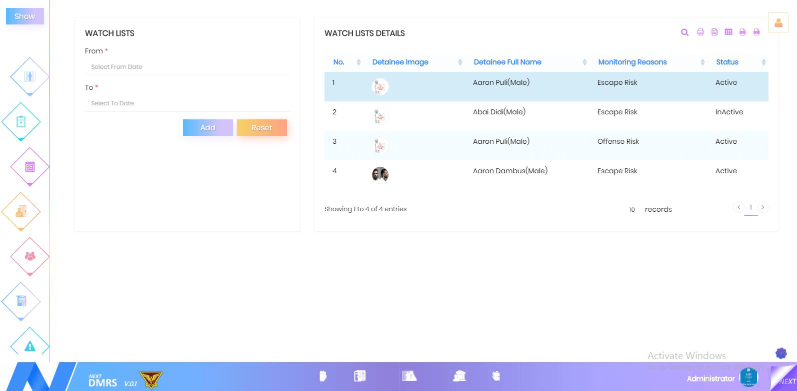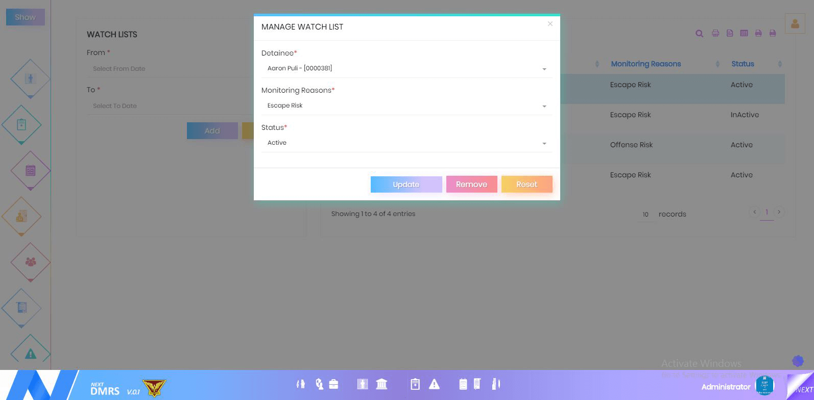 Watch Lists module, allows the Prison Jail Management to capture and manage the reasons for