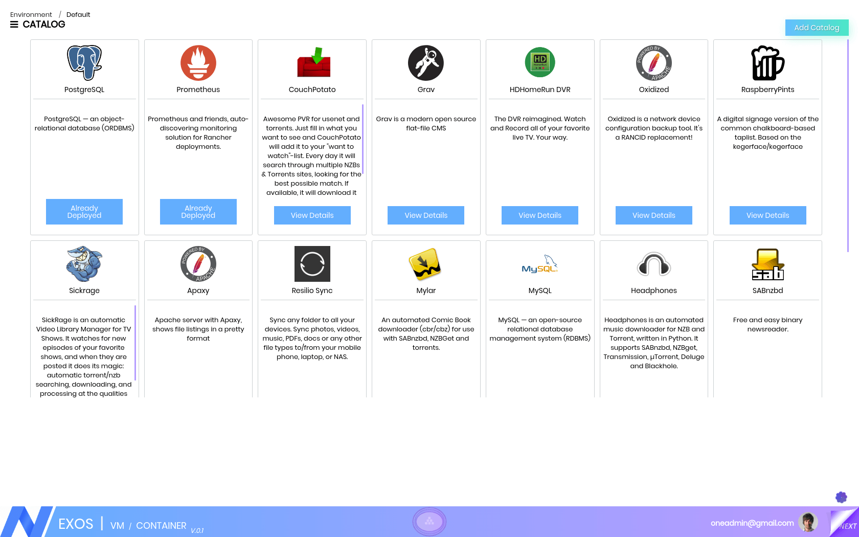 EXOS provides a catalog of application templates that make it easy to deploy these complex stacks. Catalogs are GitLab repositories filled with applications that are ready-made for deployment. Think of them as templates for deployments. By accessing the Catalog tab, you can view all the templates that are available in the enabled catalogs.