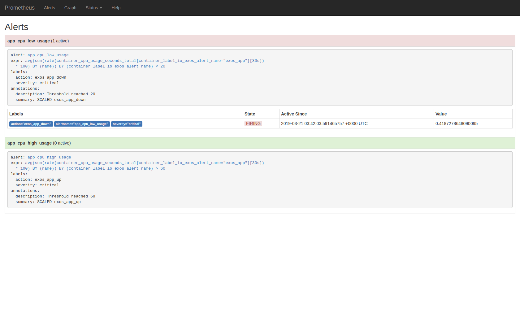 After Prometheus and Alert manager have been updated with alerts and hooks, make sure the services were restarted in order to have the configurations updated and active. For the services that alerts have been added, the services will automatically be scaled up or down based on the receiver hook that was created.