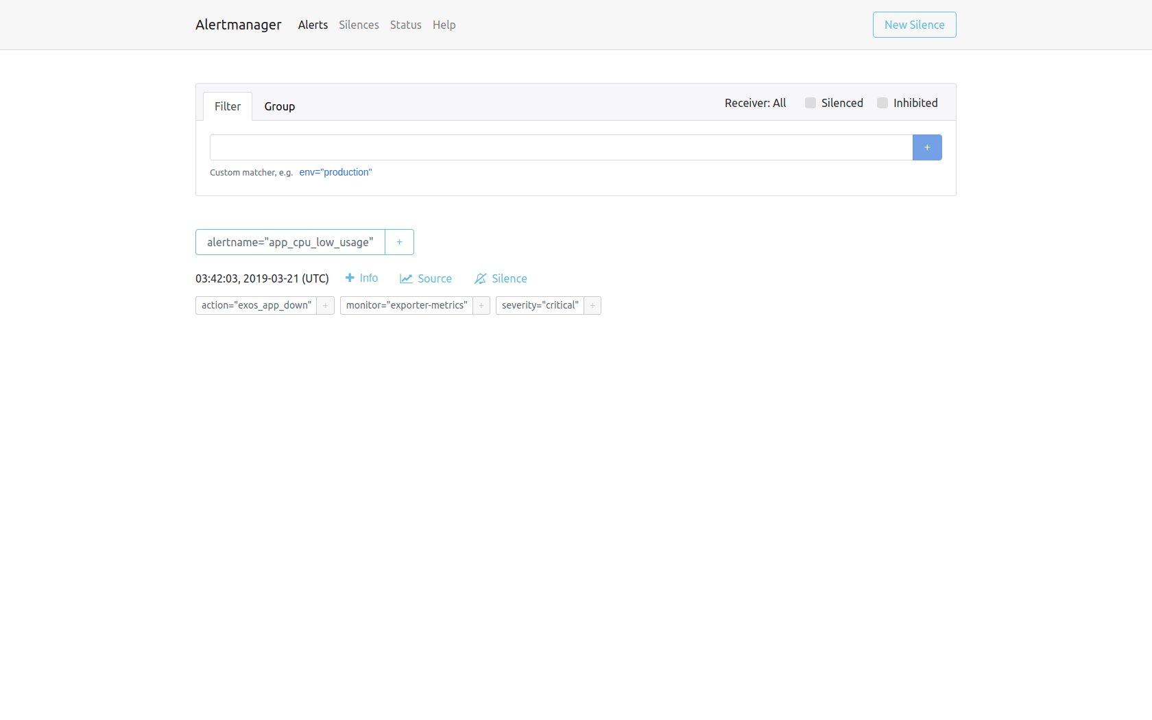 Prometheus is offered through the EXOS Catalog and can be found under the Catalog. Launch Prometheus from the catalog entry. Within the Prometheus stack, find the service called Prometheus, which is exposed on port 9090 In order to call the receiver hook, Alert manager will need to be launched. We can add it to the Prometheus stack.